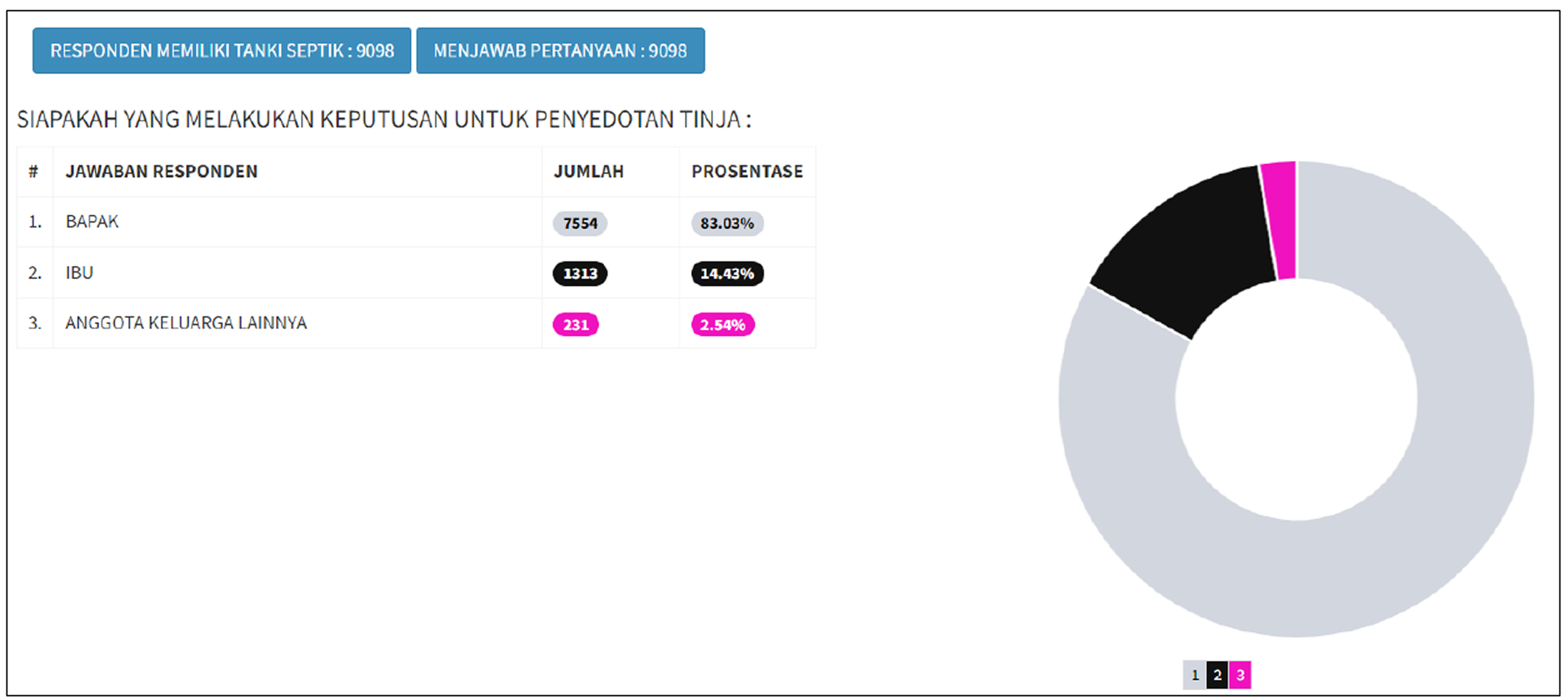 Berdasarkan Laporan Hasil Survei Kondisi Fasilitas Air Limbah Setempat yang dilakukan oleh Perumda Tirta Musi didukung oleh proyek Capacity Development Technical Assistant (CDTA) Kemitraan Indonesia Australia untuk Infrastruktur (KIAT), diketahui bahwa Bapak atau laki-laki kepala keluarga menjadi anggota keluarga yang paling berperan dalam mengambil keputusan melakukan penyedotan tinja di rumah tangga (83,03%).