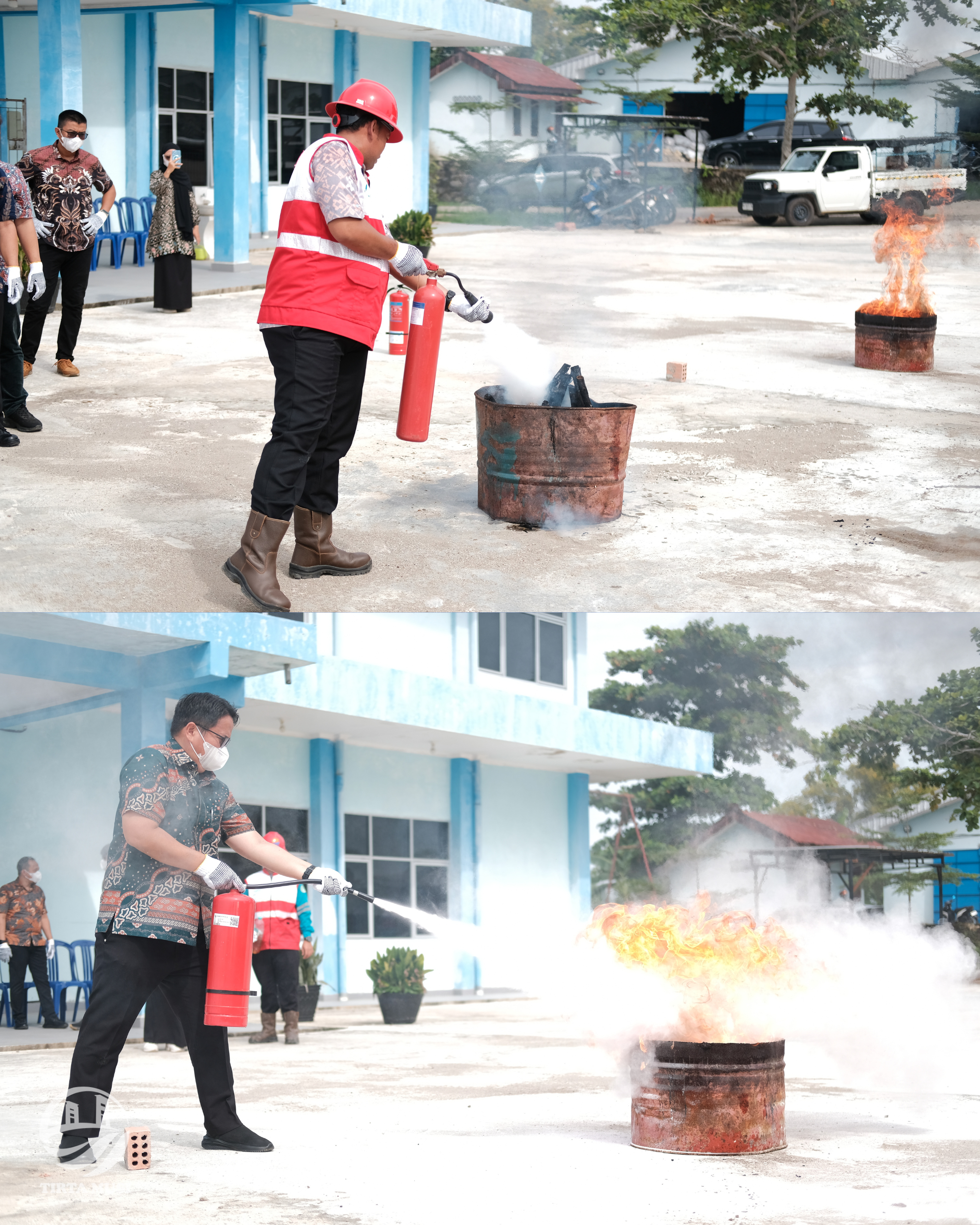Pelatihan diawali dengan penyampaian materi mengenai prinsip dasar penanggulangan kebakaran ringan, jenis–jenis APAR, serta prosedur keselamatan yang harus dipatuhi selama penanganan insiden. Setelah sesi pemaparan, peserta diberikan kesempatan untuk melakukan simulasi langsung di lapangan, dipandu oleh tim P2K3 Perumda Tirta Musi Palembang.