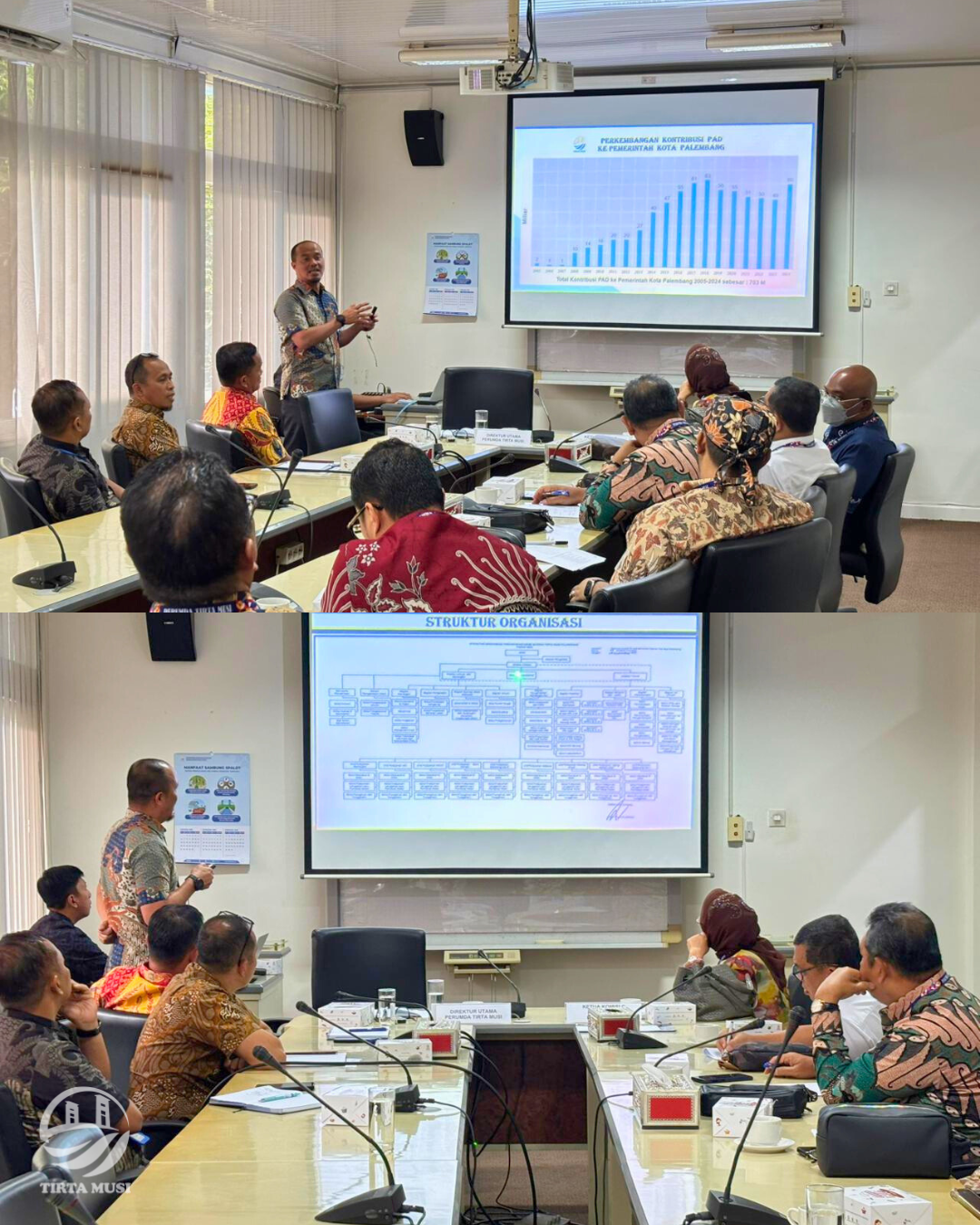Perumda Tirta Musi Palembang menerima kunjungan kerja dari Komisi C DPRD Provinsi Sumatera Utara bersama Perumda Tirtanadi Sumut, Biro Perekonomian Setda Provinsi Sumatera Utara, serta Badan Keuangan dan Aset Daerah Provinsi Sumatera Utara. Pertemuan berlangsung di Ruang Rapat Gedung Utama Perumda Tirta Musi Palembang.
