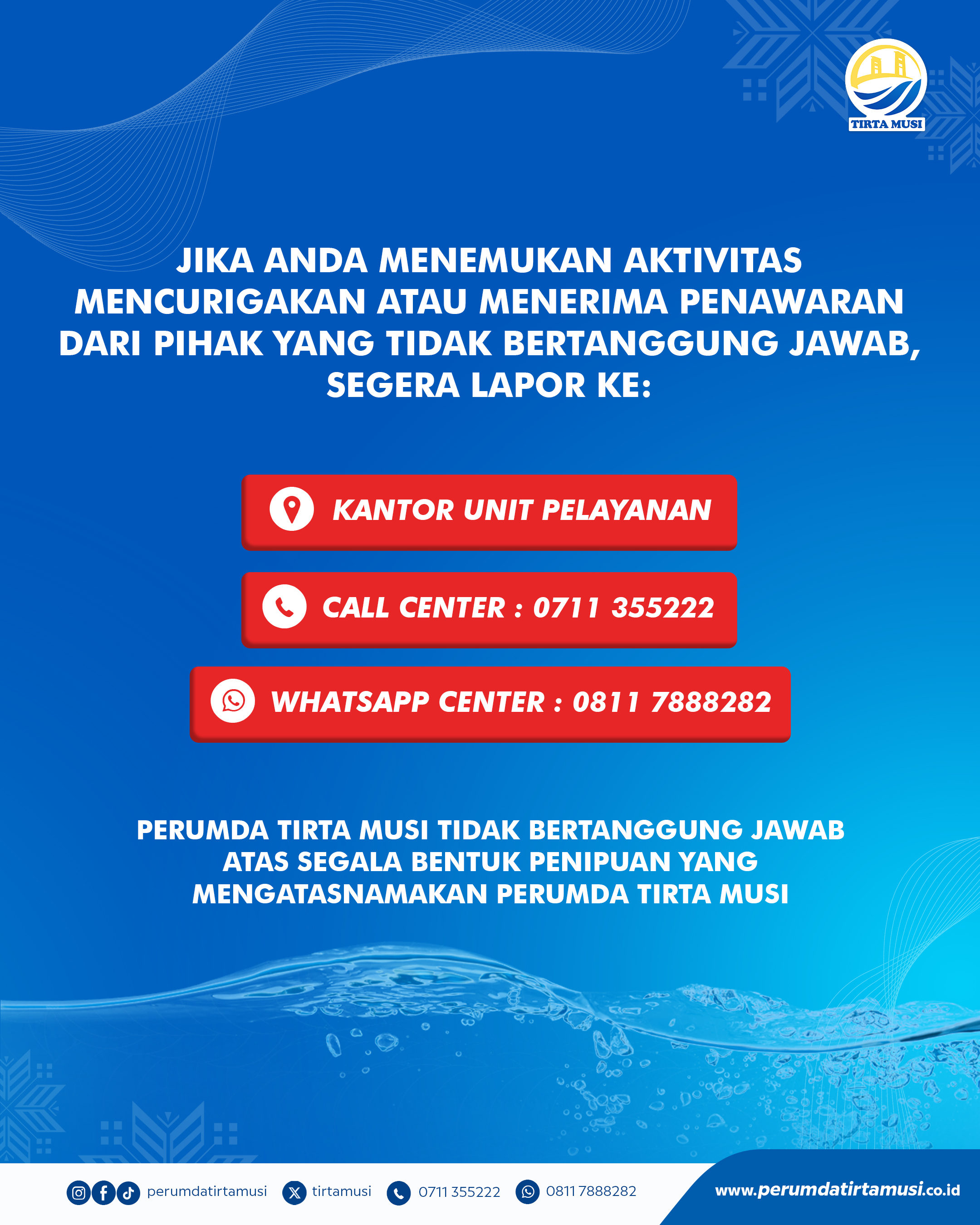 Perumda Tirta Musi tidak bertanggung jawab atas segala bentuk penipuan yang mengatasnamakan Perumda Tirta Musi.